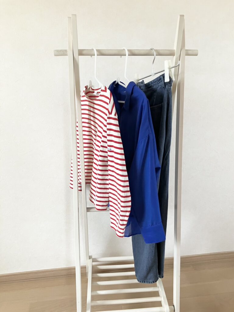 ブルーシャツとレッドボーダーTは、パーソナルカラー診断をしたときに勧められた色を取り入れてみました。